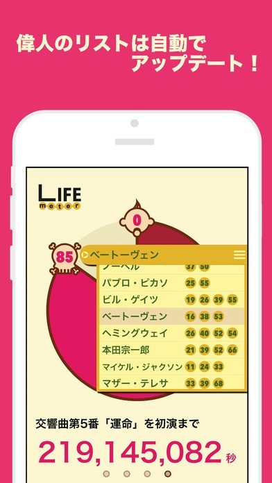 世界の偉人がおこなった出来事を自分の年齢に置き換え残りの時間の比較もできる!