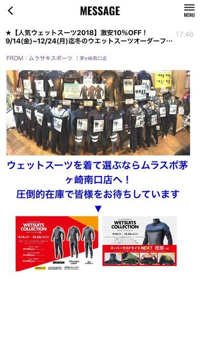 ITEMでオシャレでスタイリッシュな商品画像をタップして、お気に入りの商品の詳細な情報から購入したいものが決まったら、オンラインショップにすぐにいけます。ITEMはメンズ・ウィメンズアパレルやサーフィンやシューズなどにカテゴライズされています。アプリ右上部のMENUから、ムラサキスポーツの公式SNSやオンラインショップにもいけます。