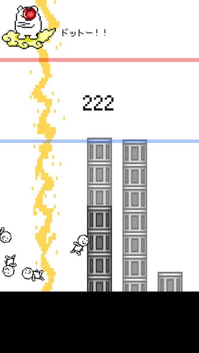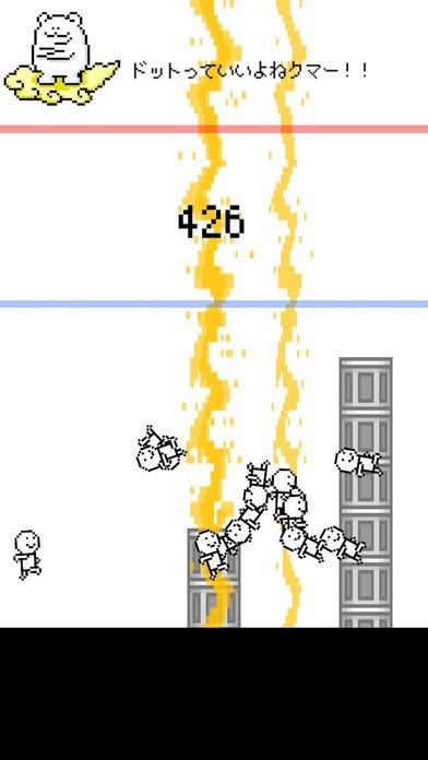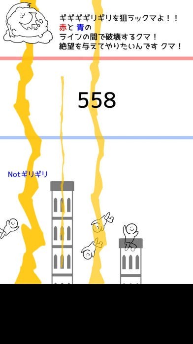 ・塔が赤い線を通過してしまうとゲームオーバーです。また、青い線より前で破壊すると、一定時間雷が落とせなくなります。