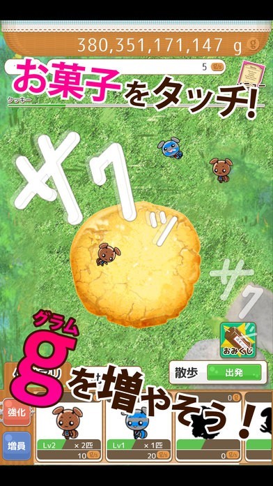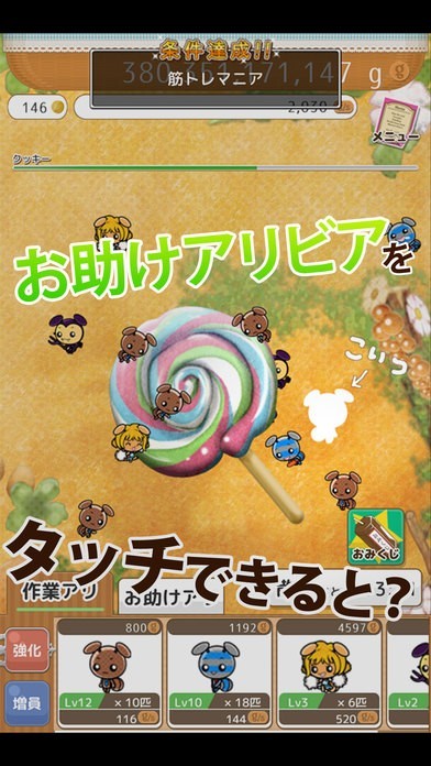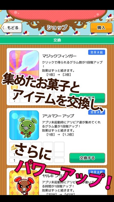 お菓子をたくさんタップすることでアリビアたちを育てたり、アイテムと交換することができる!