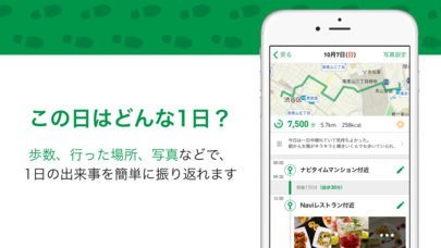 毎日のウォーキング、もっと楽しくしてみたいと思いませんか? 「ウォーキングNAVITIME-ALKOO-」は、歩数カウントなどの基本的な機能の他、ウォーキングに役立つ多彩な要素が満載! 歩数や距離、消費カロリーといった基本的なものだけではなく、ウォーキング中に咲いていた花の写真や景色の写真まで、このアプリにすべて記録することができちゃいます! 独自のナビによるルート検索で周辺のお店までチェック可能。 たっぷり運動した後は、素敵なカフェを検索して一休みなんて使い方もできるでしょう。
