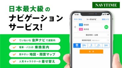 NAVITIME(ナビタイム)は電車の乗換案内をしてくれたり道案内をしてくれる地図アプリサイトです。 徒歩はもちろん車でもナビしてくれるからこれ1つ入れておけばとても便利です。 事前に道を調べて置く手間もいらないので時間短縮に、そして地図を見ることが苦手な人でもリアルタイムでナビしてくれるから迷うこともありません。 道案内のプロがすぐ近くでナビしてくれているようなものなので安心です! サービス内容は充実しているし機能もたくさんあるので手放せないアプリになりそうです。