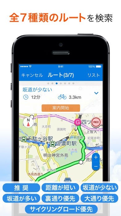 「自転車NAVITIME (自転車ナビタイム) - サイクリングが楽しめる自転車専用ナビアプリ」では、自転車で目的地に向かうのに有効なアプリです。通常のMAPとは違い、目的地までの所要時間を自転車のスピードで計算され表示されるので待ち合わせ時間に合わせて出発が出来ます。また、行き先を検索すると「体力をつけるルート」「最短距離」等の様々なルートが出てくるので、自分の目的に合ったサイクリングを楽しめます。目的地までは音声によるナビゲーションを使用すれば、画面を見ること無く安全な運転をすることが可能なナビアプリとなっています。