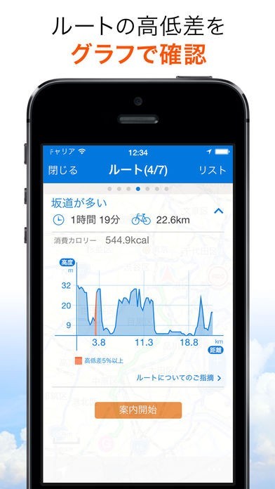 目的地までの高低差をグラフで表示してくれるので、休憩ポイントなどを設定しやすい