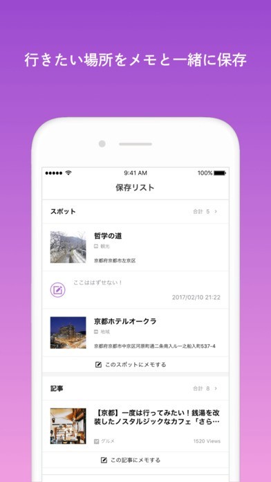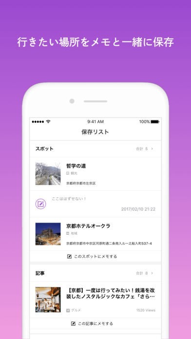 ・気になる記事やスポットを保存し、メモを残すことができます