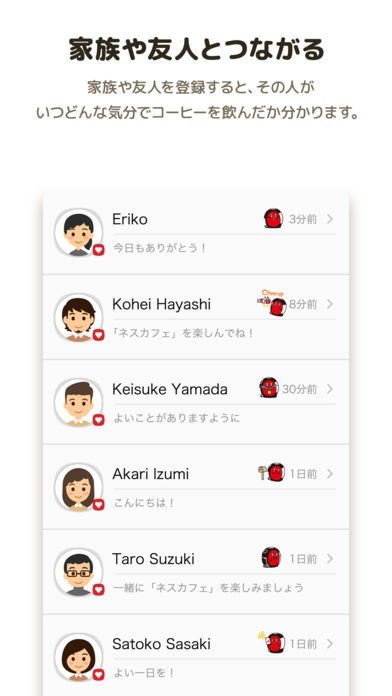 ネスカフェのバリスタiを持っている家族やお友達をアプリの友達リストに登録すれば、お友達とコミュニケーションをとったり、同じタイミングで珈琲を飲みチアーズ機能で交流を深めることができます。お友達がいつコーヒーを飲んだかもわかるので、会話も弾みます。
