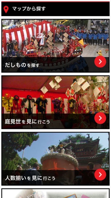 それぞれに踊町の出しものや楽器などの小物を紹介する「庭見世」に関する情報を見る事ができ、それぞれの位置情報や営業時間なども調べることが出来るようになっています。