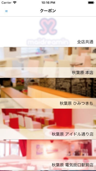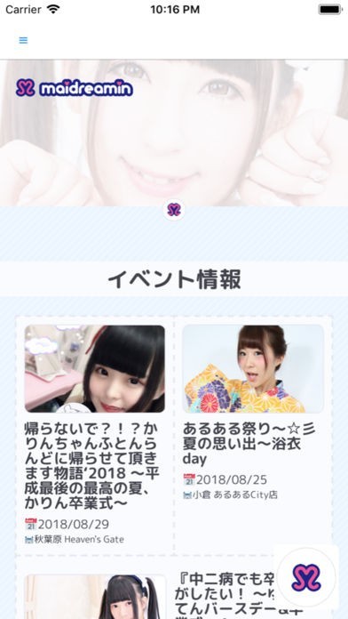 めいどりーみんアプリは秋葉原や池袋、名古屋、大阪、福岡、タイに16店舗を構えるエンターテインメントメイドカフェめいどりーみんの公式アプリで、機能としてはクーポンアプリとなっており、割引クーポンや、起動するごとに入店スタンプなどがもらえます。めいどりーみんのメイドの人気投票やイベントへの参加もこのアプリで行なえ、めいどみーりんをより楽しめるミッションも用意されています。