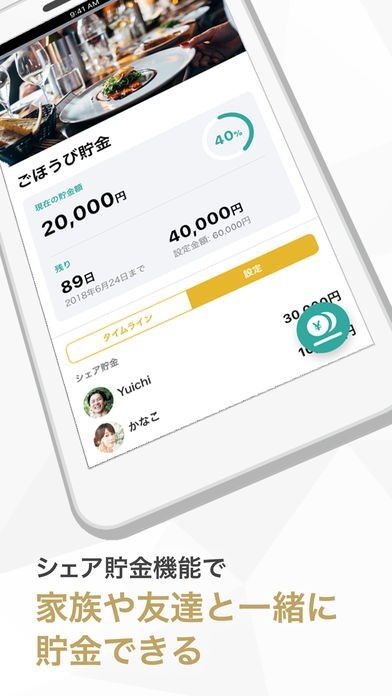 貯金が苦手な人でも簡単に楽しく貯金が楽しめます!アプリをインストールして自分の好きなこと、やってみたいことをチェック。その目的のために目標貯金額を決めましょう。つみたて貯金や歩数貯金、チェックイン貯金など、自分にあった貯金方法を選ぶことができます。銀行口座に連帯したアプリなので貯金額も一目でチェック可能です。家族で貯金や一人での貯金など、目的に合わせて楽しくお金を貯めることができます。お祝いや旅行、急な出費など、様々な時に備えて楽しく貯金してみましょう!