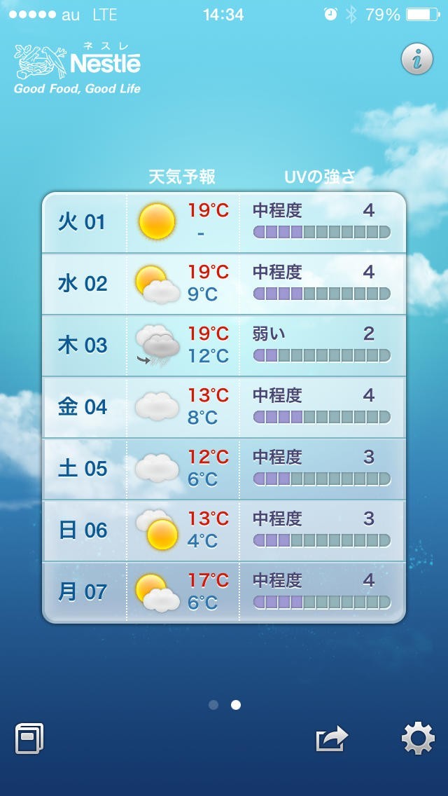 紫外線量だけでなく、1週間の天気予報もこのアプリひとつでOK
