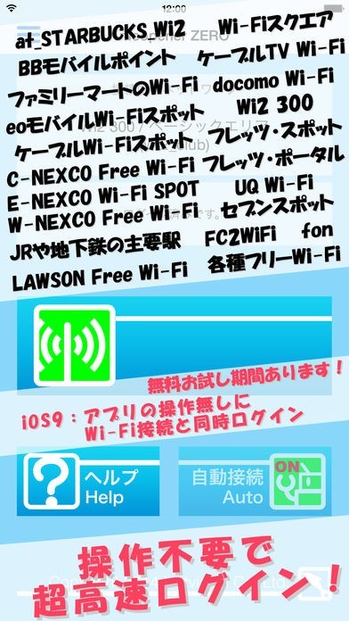 各種コンビニや駅の構内などといった有名な公共Wi-Fi設備30種類に対応。あらかじめ登録しておいたIDやパスワード情報をもとに接続できるWi-Fiエリアを検知しだいネットワークに自動で接続できます。