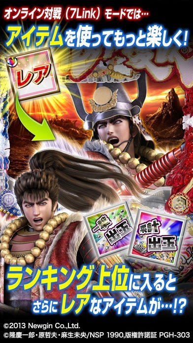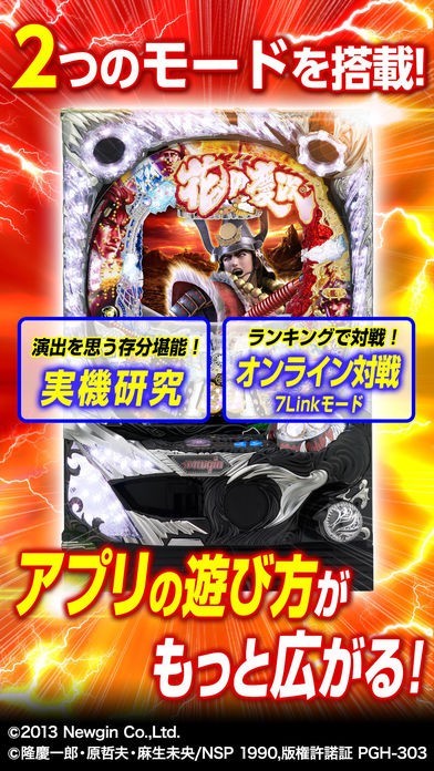 このパチンコアプリは、実機同様に傾奇御免役物や暁フラッシュなどの役物機能が搭載され、原作ファンも納得の仕上がり、登場キャラクターも実機同様なので、実際にパチンコを打っている気分を充分味わえる。