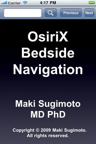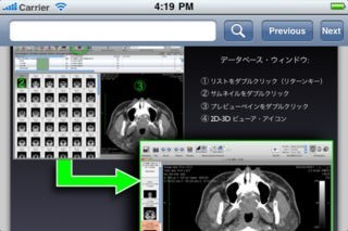 OsiriXで獲得した画像や動画データの管理や配信、書き出しができるので、共有も容易に。しかも複数の端末から同時にアクセス可能。 OsiriX Navigatorを使えば、スマホなどで利用できるOsiriX Mobileの利用もOK。 iPhone/iPod Touch専用アプリですが、データの蓄積と管理だけでなくこれらの端末を使いビューワーとしても使用できます。
