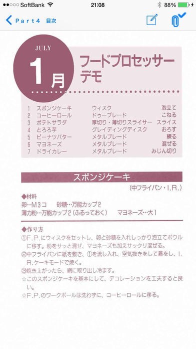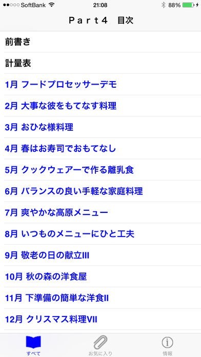 料理のレシピは月ごと、カテゴリごとに分けられているため、目次から簡単に指一本でタップして探していくことができます。調べたい料理がすぐに簡単に見つかるので料理を覚え始めた子供さんにもおすすめです。