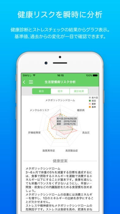 App Storeより引用健康を意識する全ての人に!このアプリで、心身の健康管理から生活習慣病リスク分析まで行います。病気を予防して、健康を維持しよう!