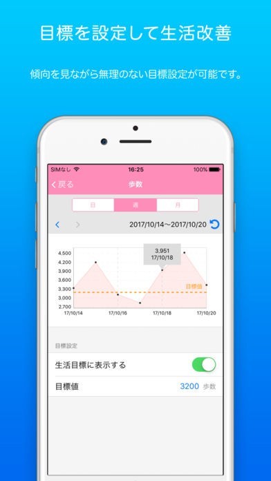 歩数、体重、血圧などに、目標値を設定できます。