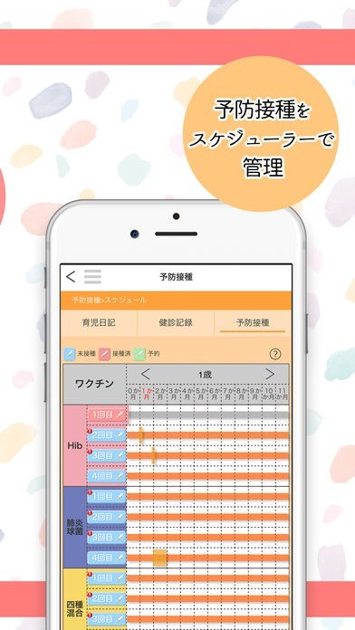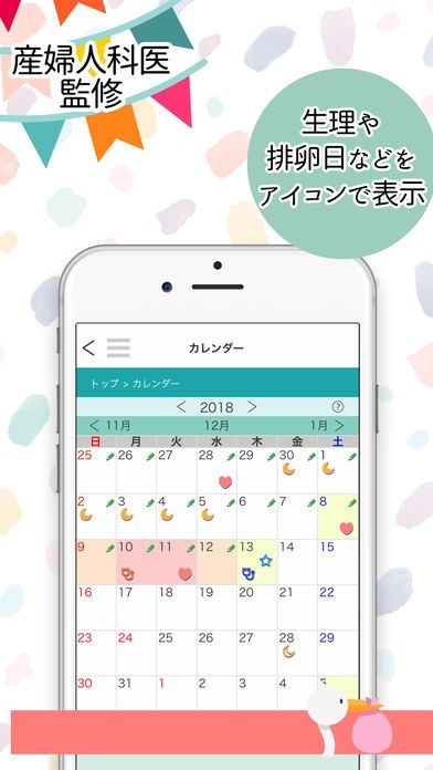 生理や排卵予定日、病院や予防接種の予約などをアイコンでわかりやすく表示。