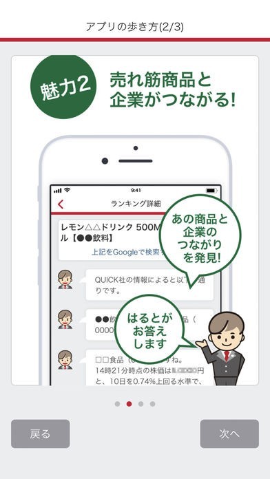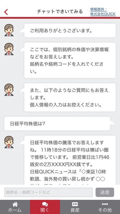 チャット機能が入っているので、現在の日経平均株価や企業ニュースを問い合せることができます。電話やネットを開いて調べる手間もないので、急いでいる時にもぴったりです。