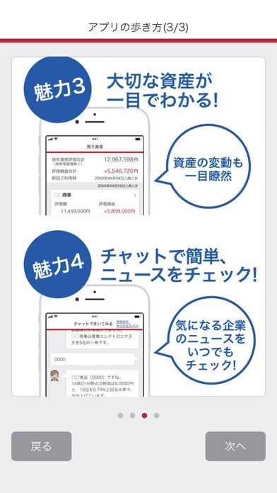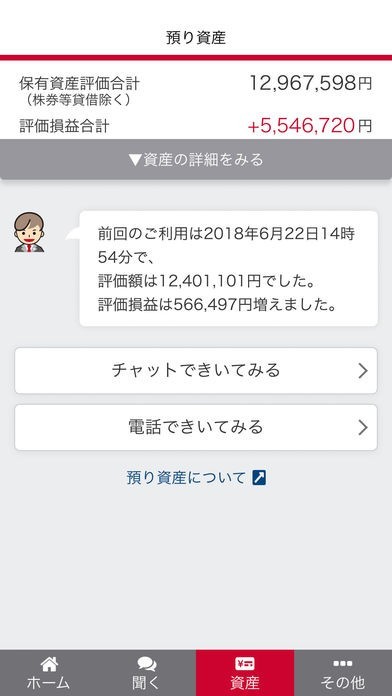 日経平均株価などの指数情報はもちろん、保有している銘柄の情報もチェックでき、関連銘柄ごとにアイコンをつけられます。預かり資産も一目でわかり、不明点はチャット機能で質問できます。