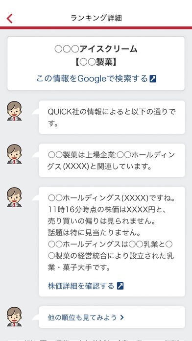 ランキング機能は随時更新され、日経平均株価、国内上場株式の株価・企業情報、銘柄にかかわるニュースについて、チャット機能で質問できます。預かり資産も一目でわかり、投資判断のお伴に最適!