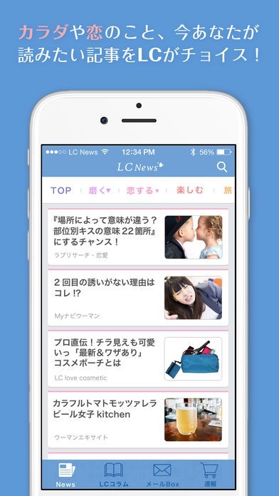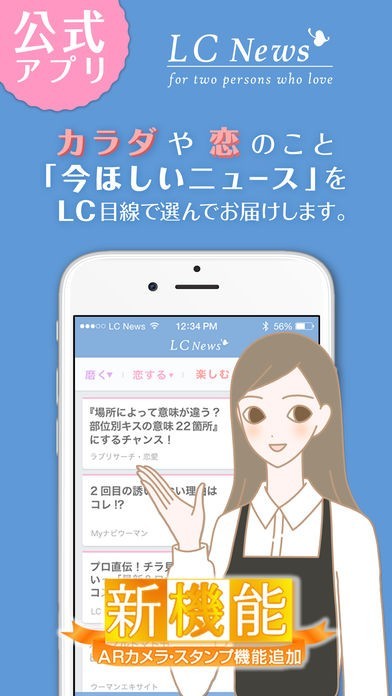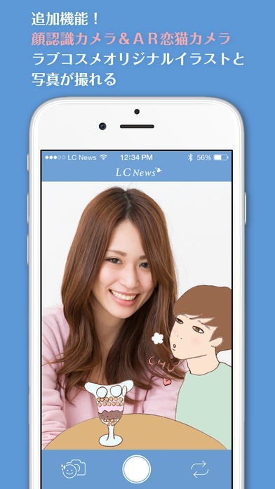「LC News」は、エルシーラヴコスメティックの公式アプリとして、女の子が欲しいニュースを届けてくれるようになっています。自分磨きや恋に関する話など、さまざまなジャンルの記事を読むことが可能となっているほか、顔認識カメラ機能でオリジナルイラストを使用したスタンプ写真を楽しむことも出来るようになっています。