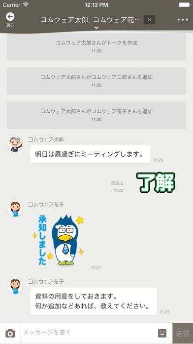 ・メッセージはテキストのほか、スタンプやファイル添付が可能です。