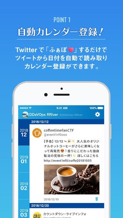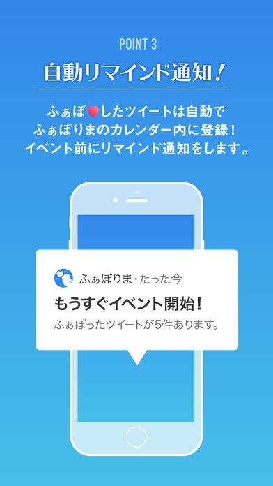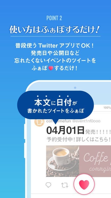 App Storeより引用Twitterで「いいね(ふぁぼ)」したツイートから日付を自動で読み取り、カレンダー登録&リマインドしてくれる「完全無料」のアプリです!