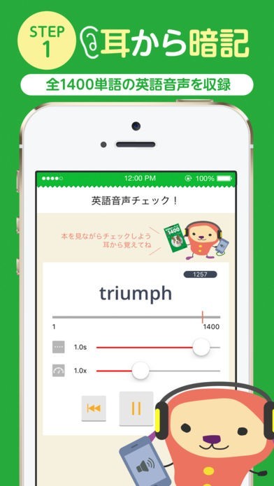 このアプリには、リスニング機能を搭載しています。1400の英単語を完備しているので、試験対策には最適。苦手特訓モードでは苦手問題の徹底の克服をしながら、自分で理解をして知識習得が可能です。