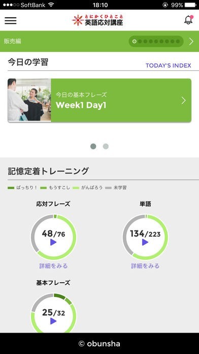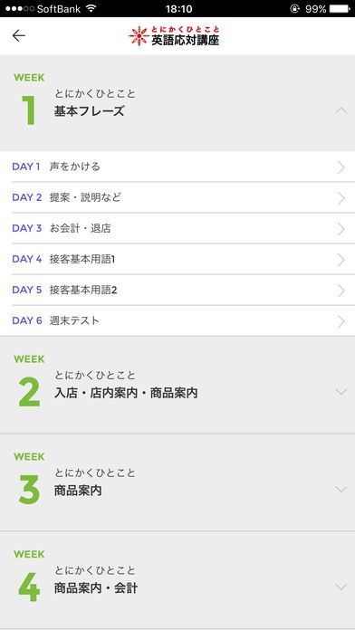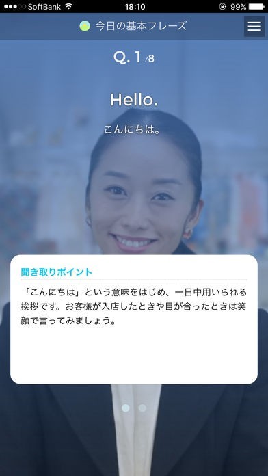 お店に来たお客様への応対に必要なフレーズ、お客様からの質問に答えたいときに便利なフレーズなど、英語の中でも仕事中に使う文章を中心に学習ができるようになっています。