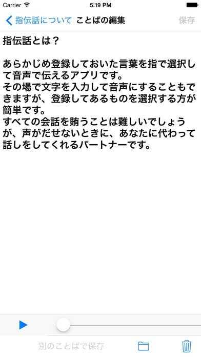 何らかの事情で直接口で話ができないとき、伝えたい内容やよく使う文章を入力・登録してタップすることで、アプリに発話させ、他の人とのコミュニケーションに役立てることができます。