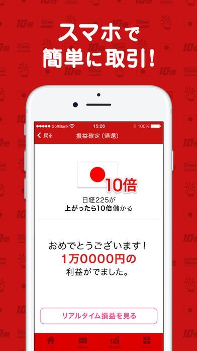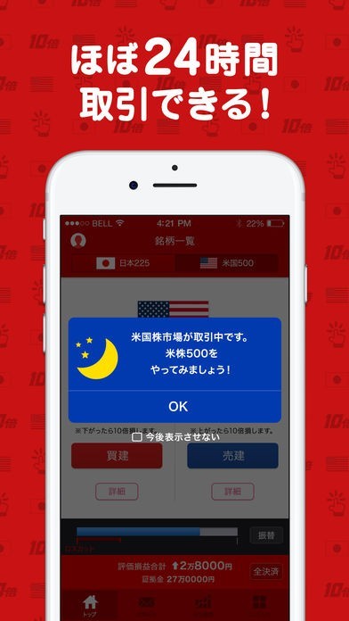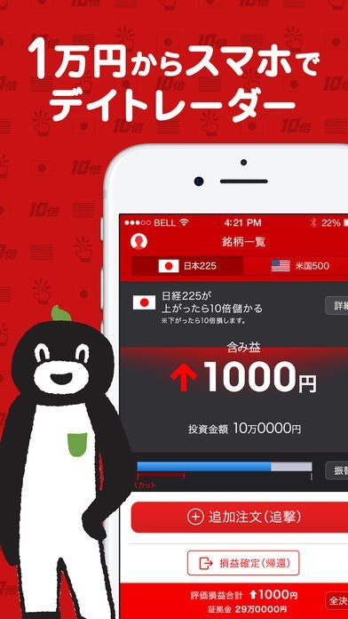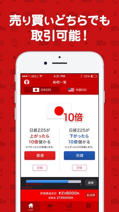 投資対象はたったの2つ。日経225に連動するCFDか、S&P500に連動するCFDです。そして買いでも売りでも自由にポジションを取れます。全てワンタップで選べ、誰でも簡単に先物投資ができるのです。