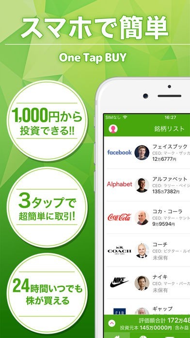 こんな時代なので堅実な資産運用が大事かと思い、1000円から株が買えるという売りに惹かれて使っています。投資初心者ならこの辺から始めるといいのでは。