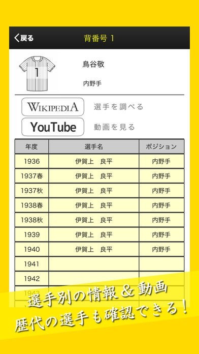 現役 / 歴代の選手の情報データも確認可能。球場でも、テレビの前でも今すぐ確認できる便利機能搭載! 阪神ファン必携のアプリです!!