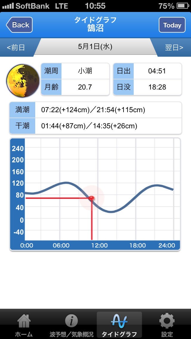 ・該当ポイントのタイドグラフ以外に、全国160ヶ所の干潮/満潮時刻や潮位をグラフで表現