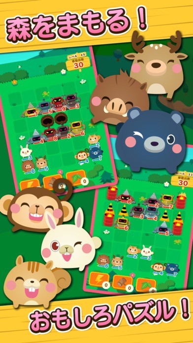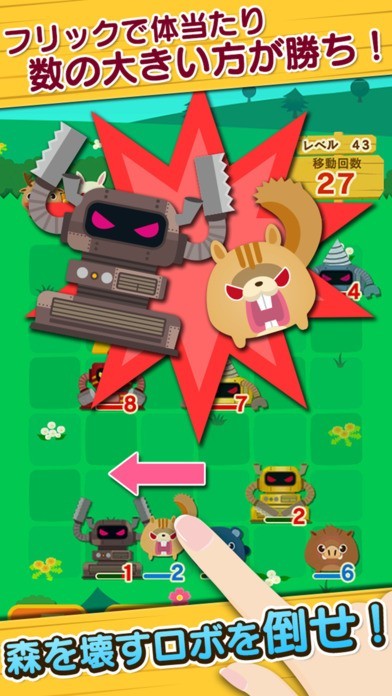 森を守り、動物たちを助けるためのおもしろパズルアプリです。動物たちは、上下左右にフリックすることができます。もりを壊すロボが出現してくるので、フリックした動物を当ててロボを倒しましょう!フリックで体当たりして数の大きい方が勝ちます。ステージは100も用意されていて、アイテムやヒントも隠されているので、初心者から大人まで楽しめるアプリです。Facebookと連携しているので、お友達とステージを競い、プレゼントを贈り、一緒に遊ぶことができます。ぜひ挑戦してみましょう!