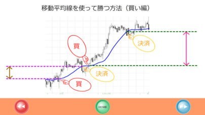 チャート上に移動平均線を表示させたとき、勝つ確率が高いパターンが現れていることを一瞬で理解する。このアプリの目的はこれです。繰り返しチャートを眺めて、頭に叩き込みましょう。