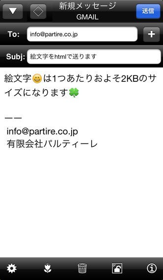 eM@il Sender Liteはメールの送信機能に特化したアプリです。無駄な機能をそぎ落とすことによって、サクサクとした操作性を実現しています。自分でカスタムした絵文字を使用できるので、自分好みのアプリにアレンジすることができます。画像ファイルを添付する際には6種類の形式から圧縮率を設定することができるので、元のデータの大きさや必要な画質に応じて選べます。手持ちのiPhoneやiPadからメールを送信する際に便利です。