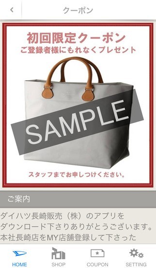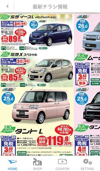 ダイハツ長崎販売アプリは、ダイハツ長崎販売の最新のチラシがいつでも閲覧でき、販売店でのお得なクーポンの案内や来店キャンペーン、イベントの案内、軽自動車や登録車など取扱車種の紹介なども確認できるようになっています。販売店チラシの機能を持っているため、新聞を取っていない環境やチラシを広げるスペースのない場所であってもダイハツでのセールが確認できます。また、ダイハツの新型車や特別仕様車の情報も配信されます。また長崎の地元雑誌とダイハツとのコラボレーション企画なども楽しむことが出来ます。ダイハツ車の新車購入の商談の際に使用するのも便利でしょう。