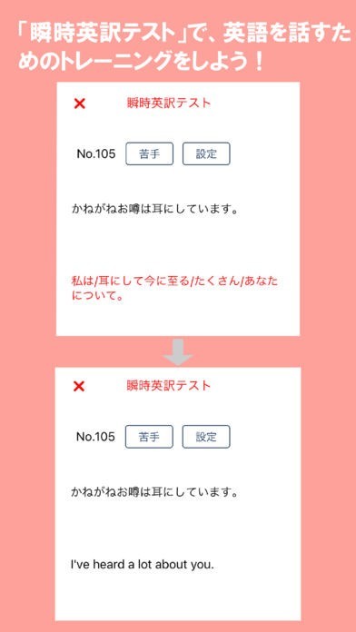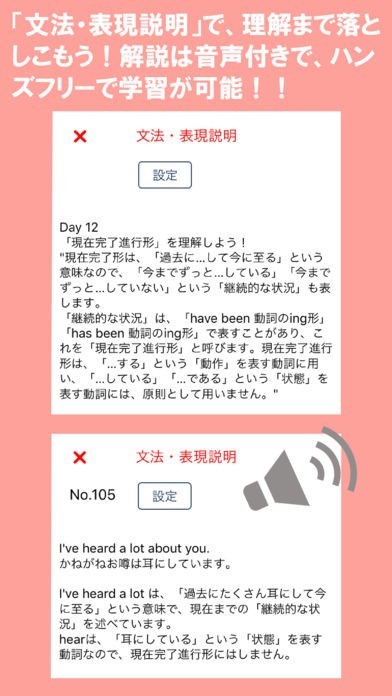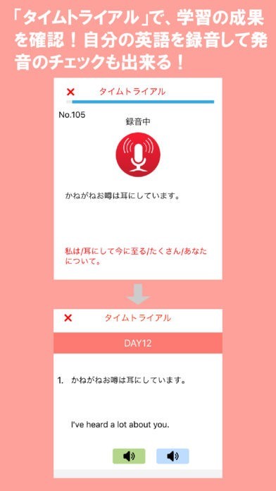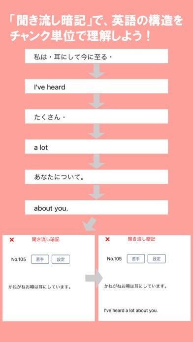 お手本の英文を最初から通して聴くのではなく、フレーズごとに分割して英語と日本語を交互に聞くことにより、それぞれのフレーズと意味を耳からしっかり覚えることができます。