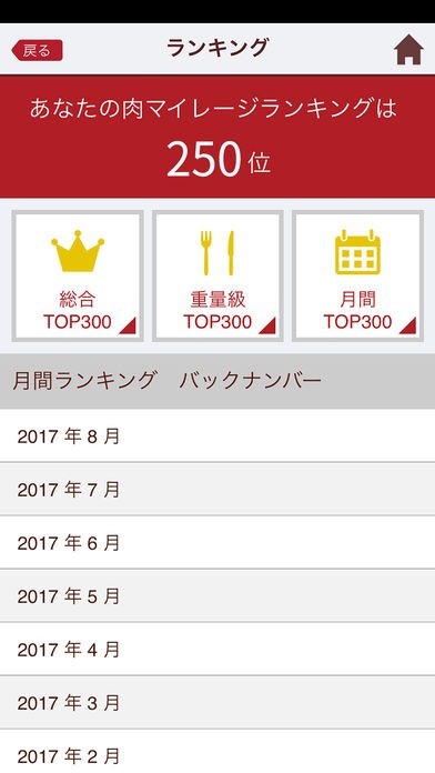 肉マイレージのランキング機能があり、自分自身のランキングや月間、重量級、総合に分かれています。食べに行く回数が多い方は、自分自身のランキングの順位が楽しみになります。