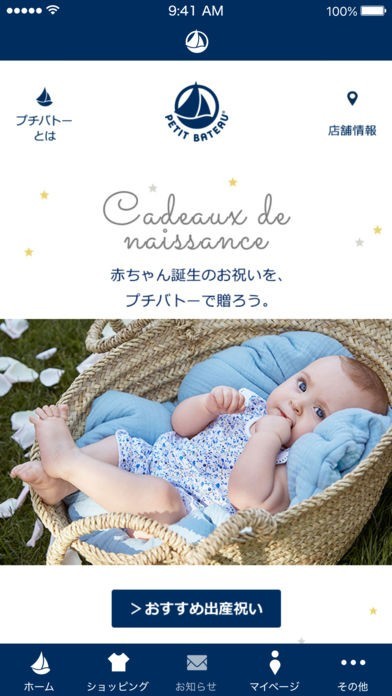 スマートフォンを使ってプチバトーの店舗やオンラインショップをもっと便利に利用することができる公式アプリとなっていて、アプリ限定キャンペーン情報などを配信しています。