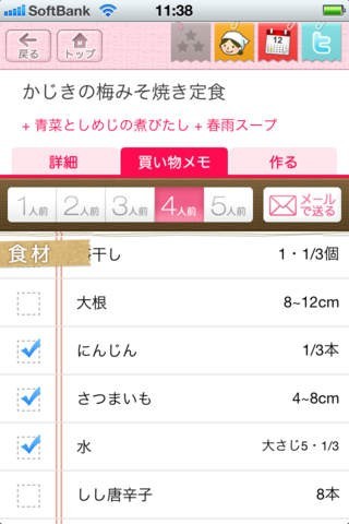 ◆買物メモ:作る人数分に合わせて必要な食材と量を自動計算し、メールで送ることもできます。