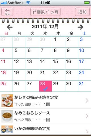 ◆カレンダー機能:作った料理の日やメモを記録することができます。