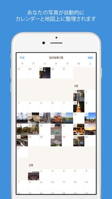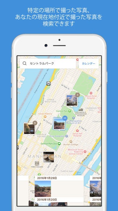 持ち歩いたスマホでさりげなく撮った写真を、カレンダーや地図上から検索できる