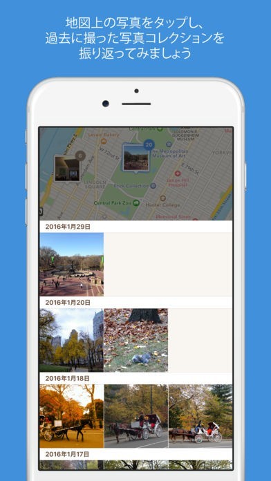 撮った写真が場所や日付で検索できるので、純粋に思い出だけを振り返ることができます。旅先で撮った写真にも、日付か場所の名前が検索できれば、どこで撮った写真かわからないということがなくなります。