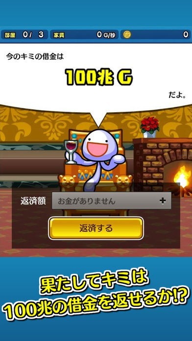 本作は強制的にマンションを買わされた主人公がバイトと家賃収入で借金を返しながらマンションをアップグレードしてくい放置ゲームです。マンションに部屋を増築すると、そこに住民が来て家賃収入が入るようになります。後は放置しておけばお金が勝手に貯まっていくので、そのお金を使って豪華な部屋を造ったり、より収入の良いバイトにアップグレードしましょう。