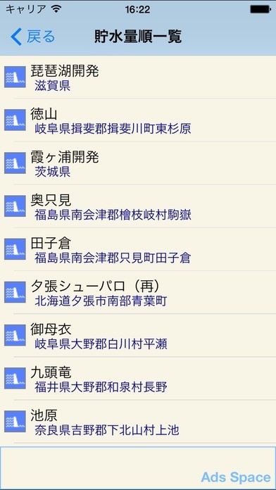 「都道府県一覧」をタップすることによって近くのダムを調べられる