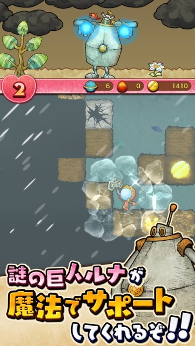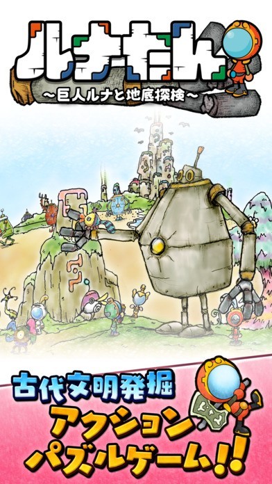 「ルナたん ~巨人ルナと地底探検~」は穴を掘って古代文明のパーツを入手する穴掘り型パズルゲームです。舞台は古代文明が滅びてから1万年後の世界。主人公は古代文明「アクアル」を再生させるため、古代の建物のパーツをもとめて穴掘りを行ないます。建物のパーツ以外にも古代の植物や動物の発見もあり、考古学者や探検家になったような気分でゲームを楽しむことが出来ます。パーツを集めていくと古代の建物が完成されていき、地上はどんどんにぎやかになっていきます。