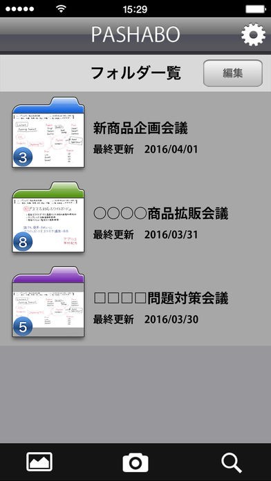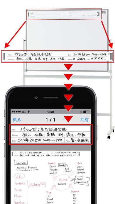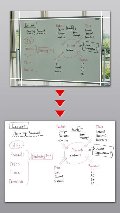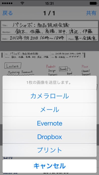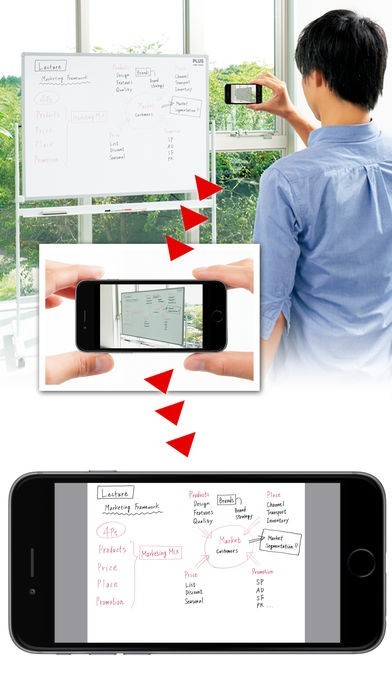 App Storeより引用本アプリは専用のホワイトボードをパシャ!と撮るだけで、独自のフレーム認識技術により台形補正し、写真よりも見やすく軽い画像データに変換するホワイトボード取り込み専用のアプリです。保存したデータは、フォルダ別で管理したり、メールやEvernote、Dropboxへ送信したり、カメラロールへ保存することができます。
