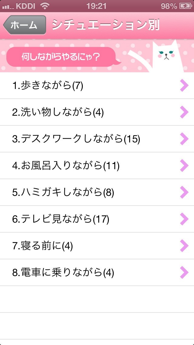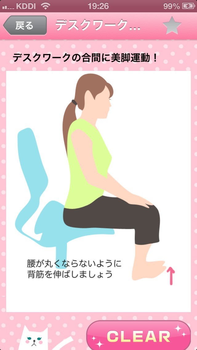 WomanAppsなどのメディアにも紹介されているこのアプリは、何かをしながら出来るトレーニング方法をたくさん教えてくれます。 よって、家事や仕事に忙しくて、なかなか時間を作れないというような方の役に立ちます。 例えば、デスクワークをしながら美脚になるための運動を行ったりするものが用意されており、しっかり運動できたら、「CLEAR」ボタンを押してかわいいネコに褒めてもらうことができます。 シチュエーション別に選ぶことによって、「電車に乗りながら」、「洗い物しながら」といったものがあるので、タップすることで鍛えたいものを選ぶことができます。 やり方は図と文字によって丁寧に説明されているので、やり方がわからないということはないでしょう。 気に入ったものは右上の星のマークをタップすればあとで確認可能です。
